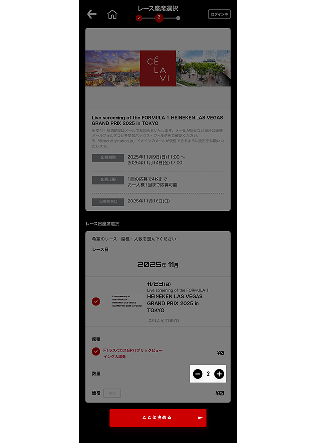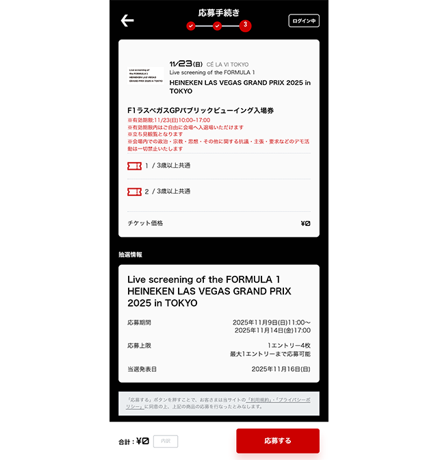 3. Please confirm the number of tickets you wish to apply for, scroll down the page, read the "Terms of Use," "Race Viewing and Event Attendance Terms," "MobilityStation Privacy Policy," and "Security," then press the "Apply" button.