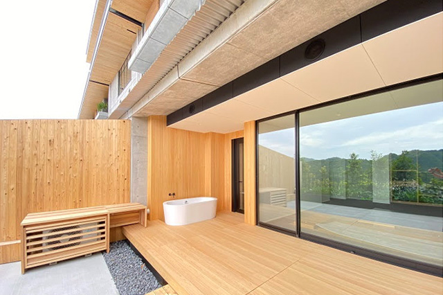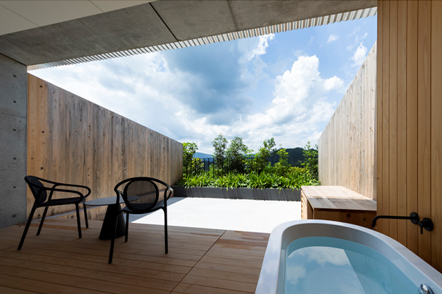 設有與客房同等大小露台並配備露天風呂的客房。採用戶外浴池、室內淋浴間、廁所及洗手台三點獨立設計,整體以白色為基調,呈現簡約現代風格。您可在日本特有的露天風呂中盡情放鬆身心。