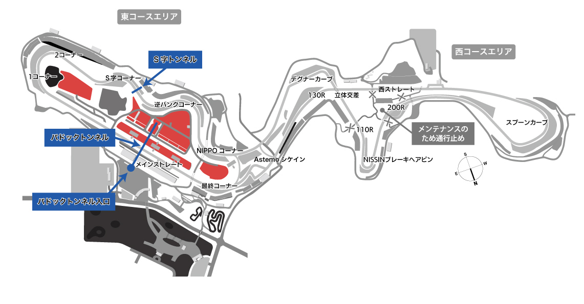 您可以利用位於賽道區域內的S字隧道,輕鬆到達S字彎~逆傾斜~NIPPO彎道!※11月20日(週四)無法使用 票券販售中!